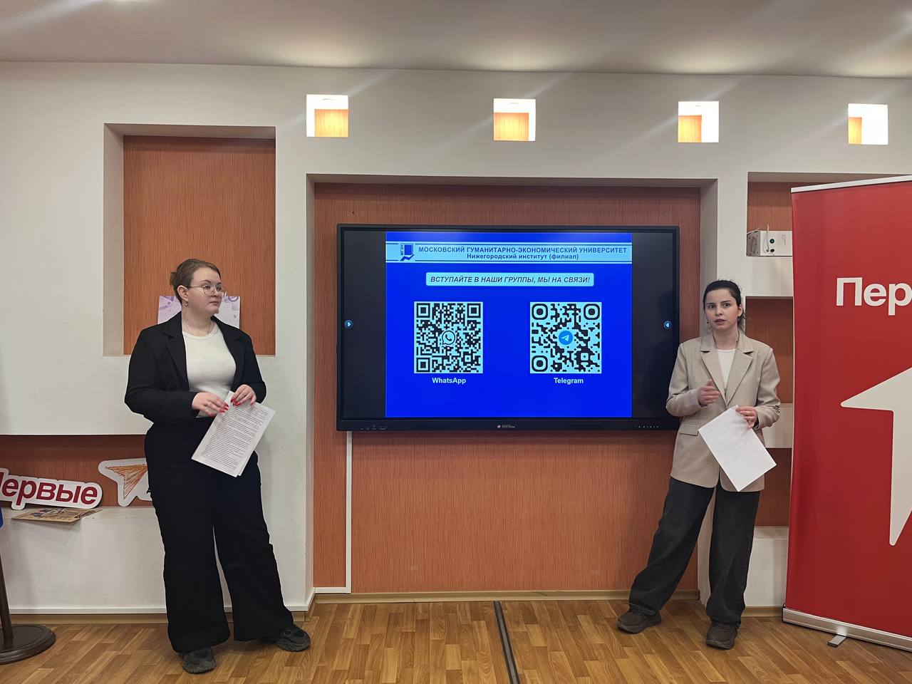 Студенты 1 курса гуманитарного факультета Нижегородского института (филиала) МГЭУ: Коршунова Елизавета, Голубева Татьяна, Толчина Татьяна, Бахмутский Ярослав проявили инициативу и активность в профориентационной работе нашего вуза и 4 декабря 2025 года выступили перед учащимися 11 класса в МАОУ лицее г. Бор Нижегородской области с презентацией о Нижегородском институте (филиале). Наши первокурсники ознакомили учащихся с направлениями подготовки и правилами поступления, ответили на все заданные вопросы и дали советы, как справиться с переживаниями и подготовиться к экзаменам.