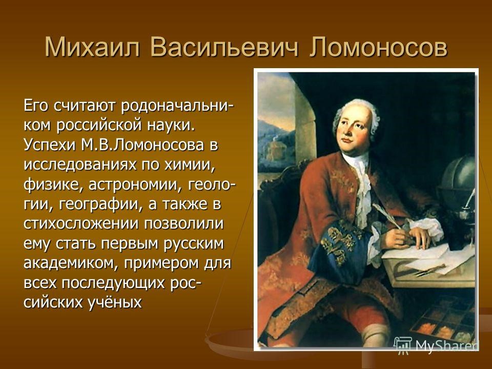 Успехи Михаила Васильевича Ломоносова в исследованиях по химии, физике, астрономии, геологии, географии, а также в стихосложении позволили ему стать первым русским академиком, примером для всех последующих российских учёных.